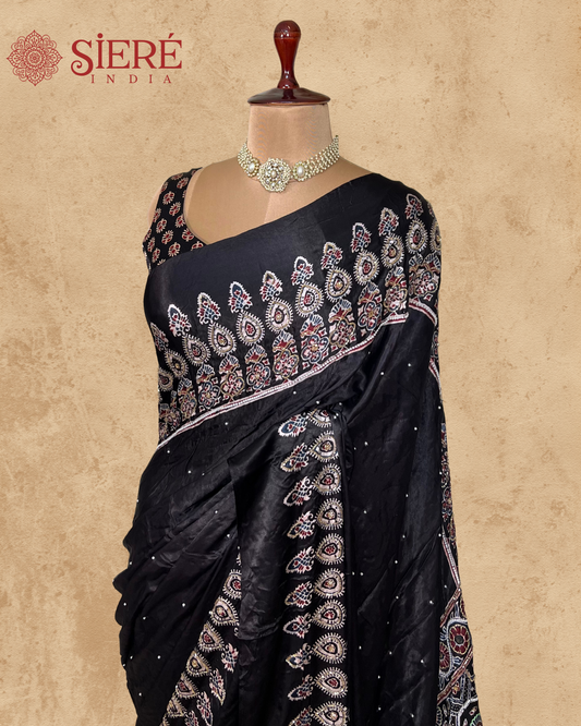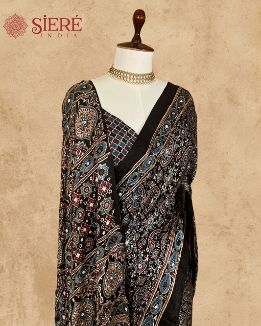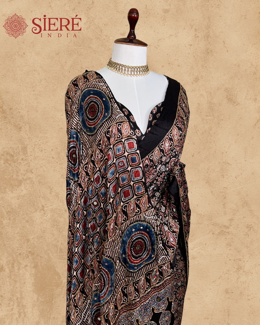 Black Pure Modal Silk Ajrakh Hand Embroidered Saree