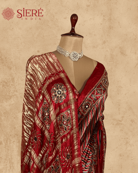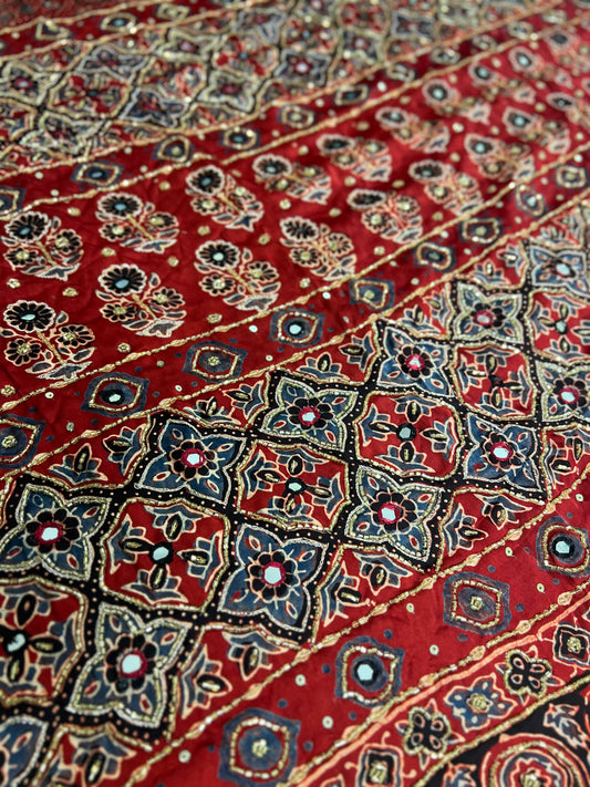 Red Pure Modal Ajrakh Hand Embroidered Saree