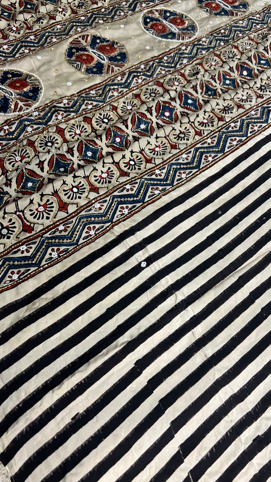 Off White and Black Stripes Modal Ajrakh Hand Embroidered Saree