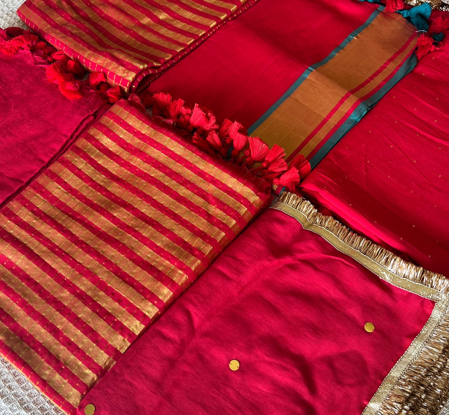 Red Stripes Pure Modal Ajrakh Hand Embroidered Saree