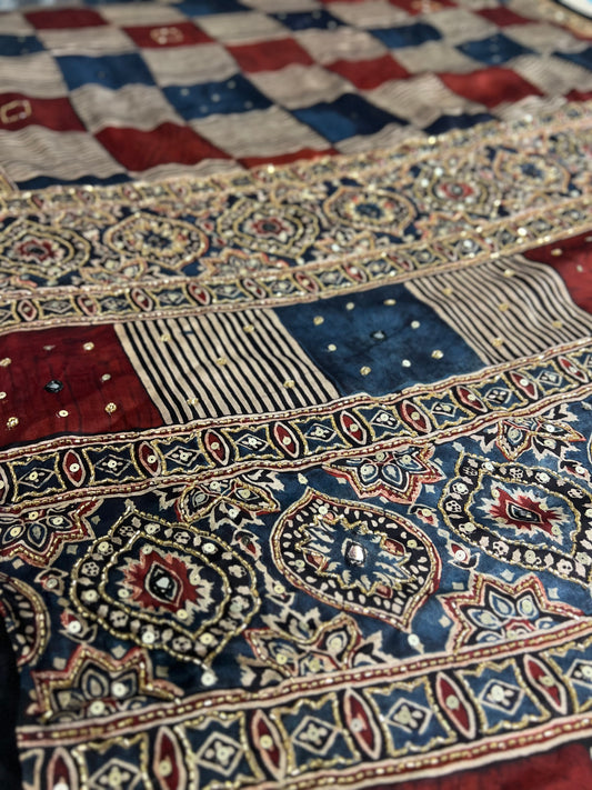 Black and Blue Pure Modal Ajrakh Hand Embroidered Saree