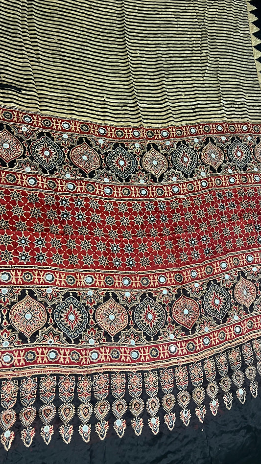Striped Modal Ajrakh Hand Embroidered Saree With Large Border