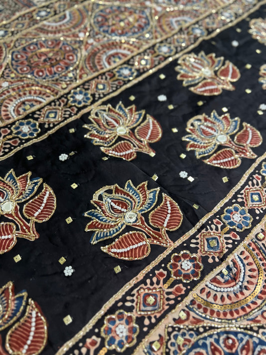 Black Pure Modal Silk Ajrakh Hand Embroidered Saree