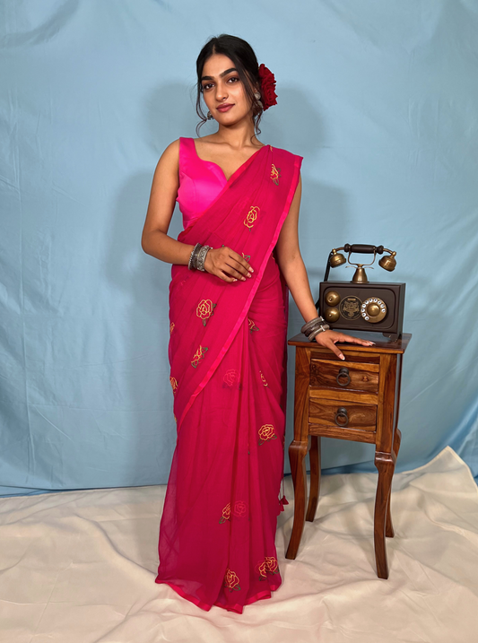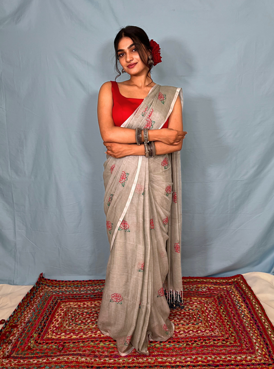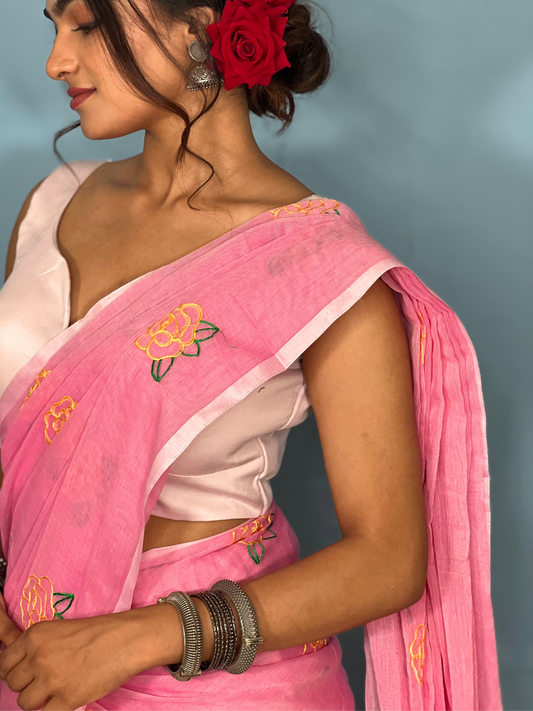 Dive into the world of "Gulabo" - Delicately embroidered roses dance on lightweight soft mul cotton saree, embodying the essence of elegance and freshness. Feel the soft embrace of petals in every drape.
