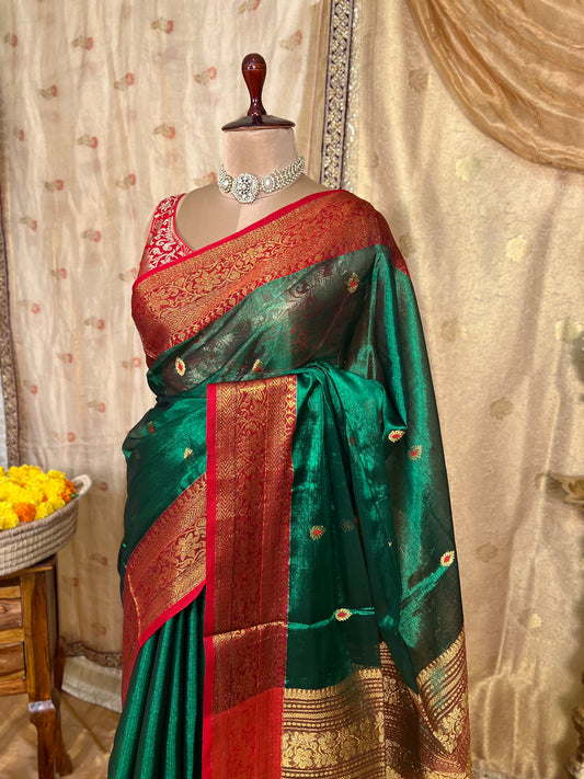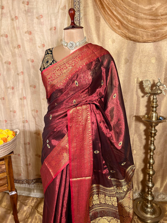 Exquisite pure mercerized tissue sarees featuring intricate banarasi details, radiating premium quality and rich elegance. Meticulously crafted to bring a touch of luxury to grand festive occasions.