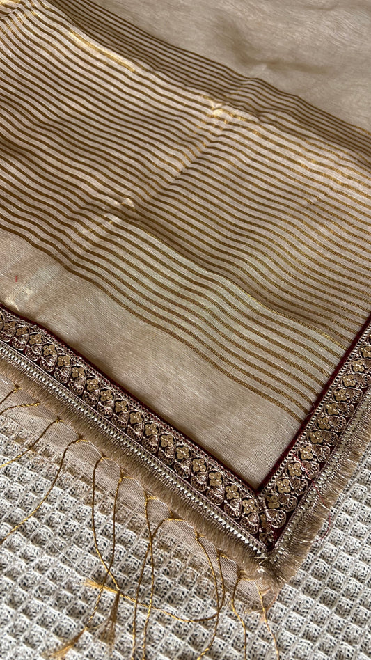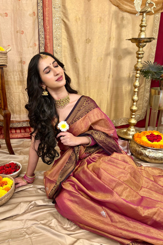 Introducing our exquisite "Amulya" collection - a symphony of elegance and luxury, Crafted from the finest Tissue Mul fabric. Adorned with exquisite Zari and a lustrous sheen that catches the light and reflects the richness of precious gemstones.