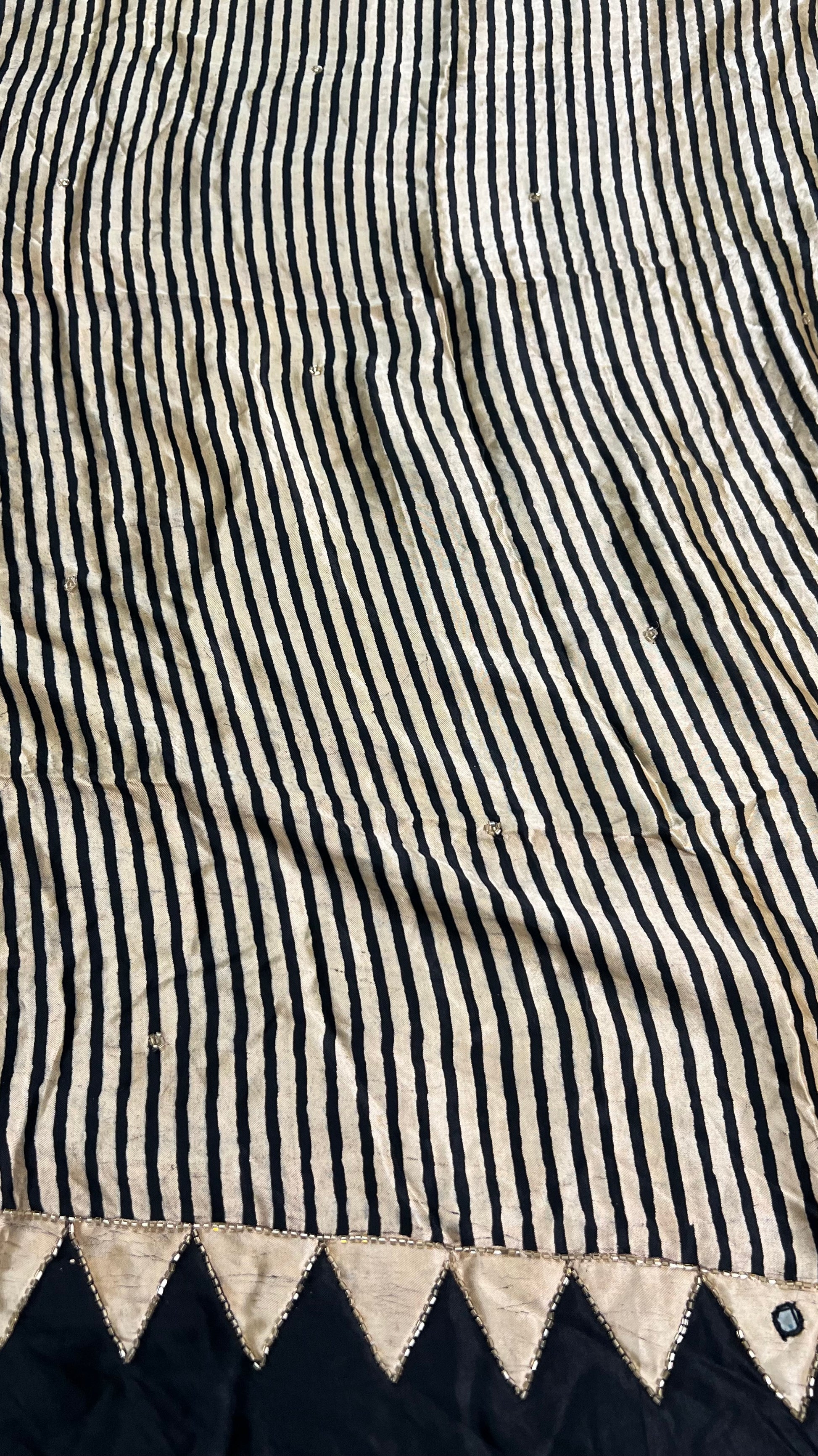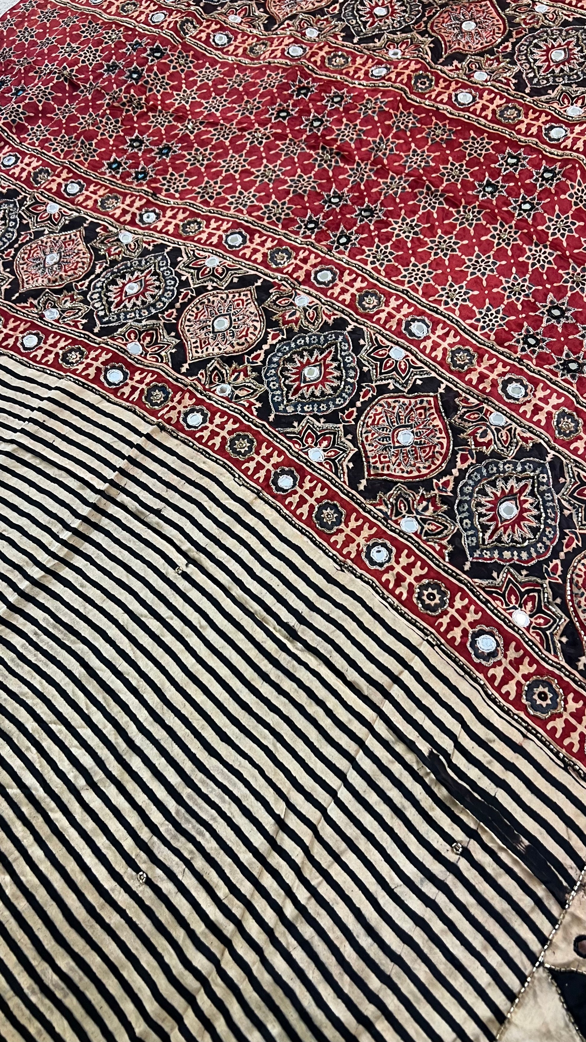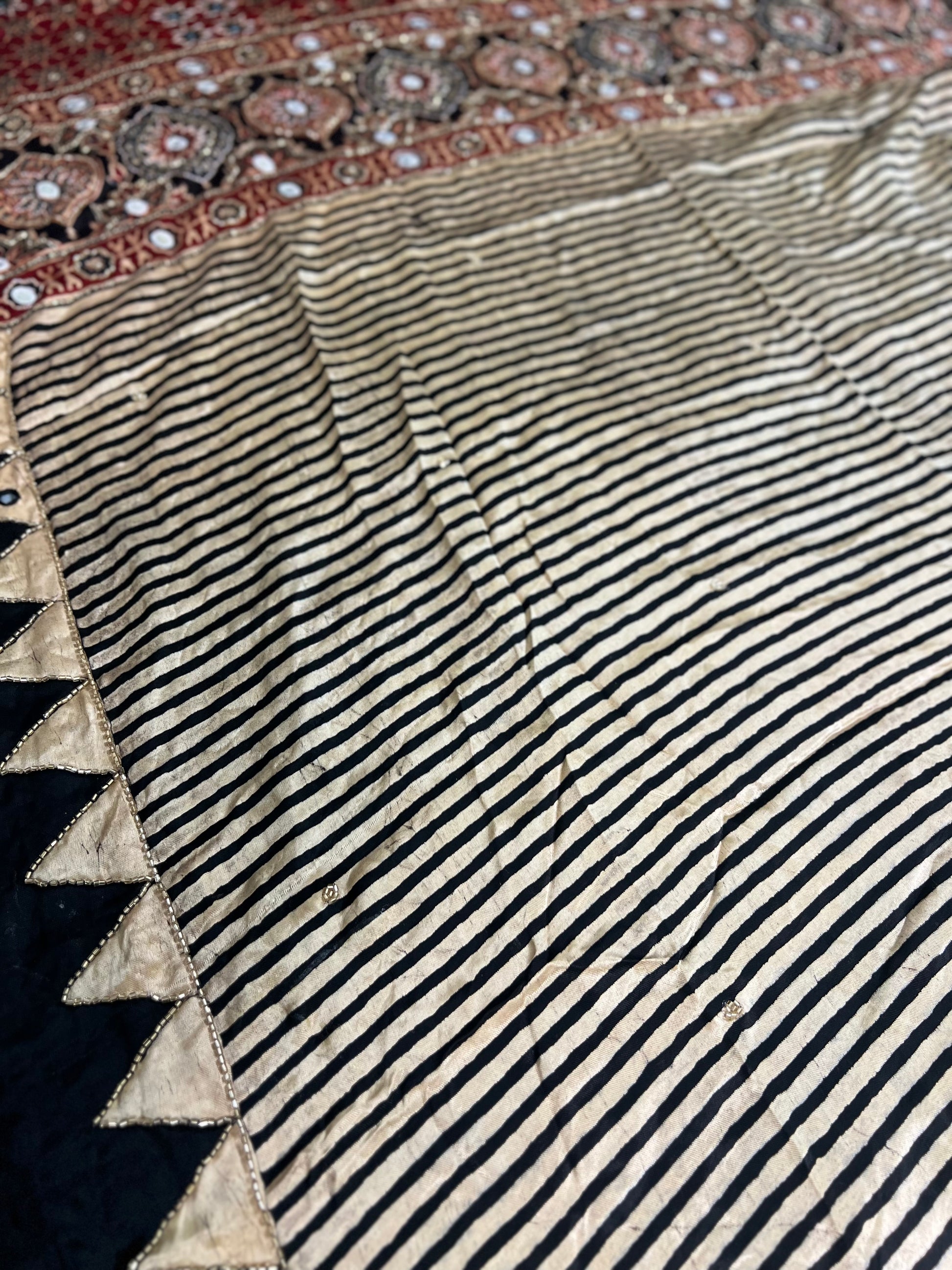 This off-white and black striped Modal Ajrakh handblock saree features a contemporary temple border and a statement red and black pallu, elevated with mirror, katdana and intricate resham handwork.