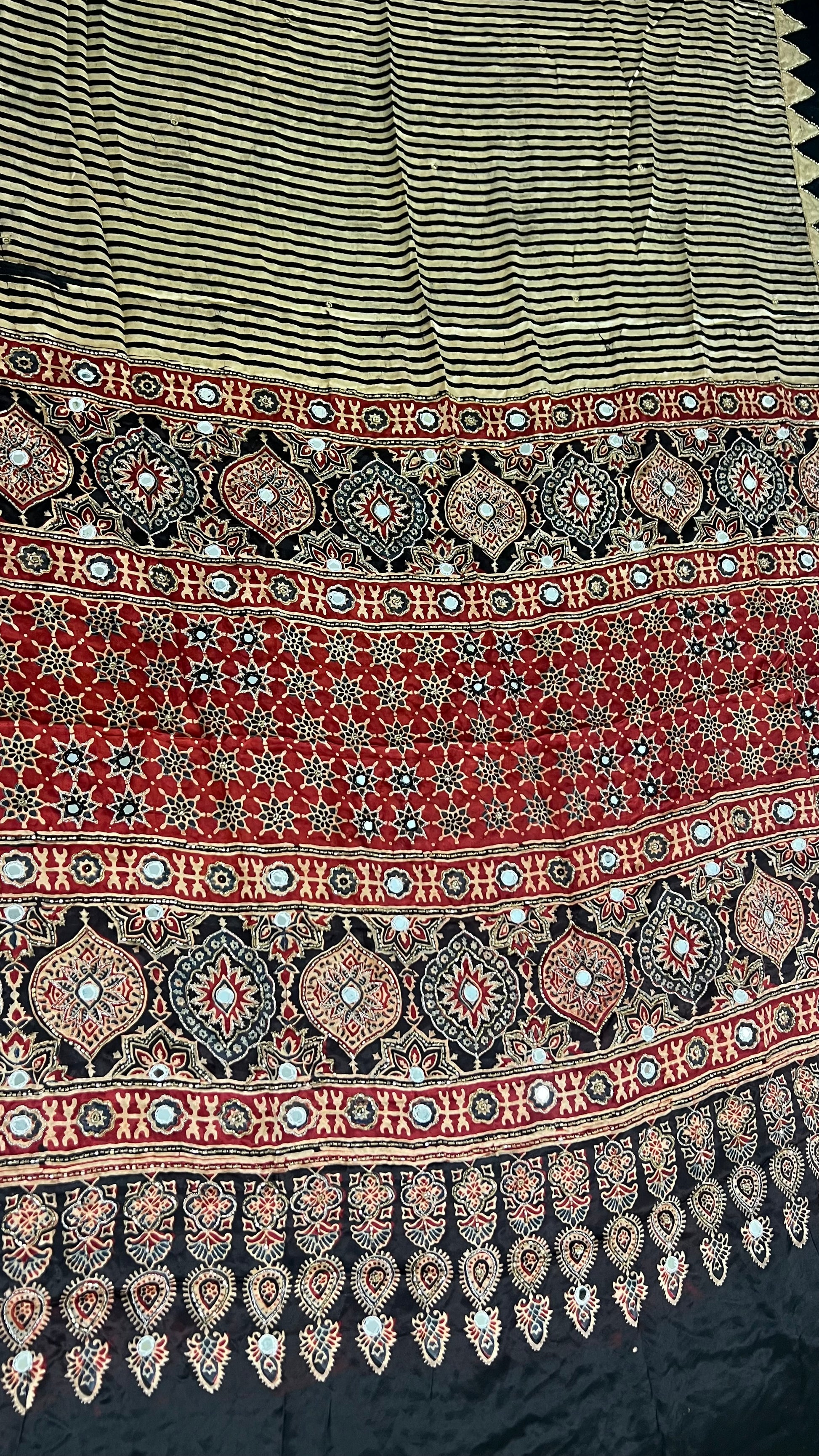Cream and Black Striped Modal Ajrakh Hand Embroidered Saree with Red and Black Motifs