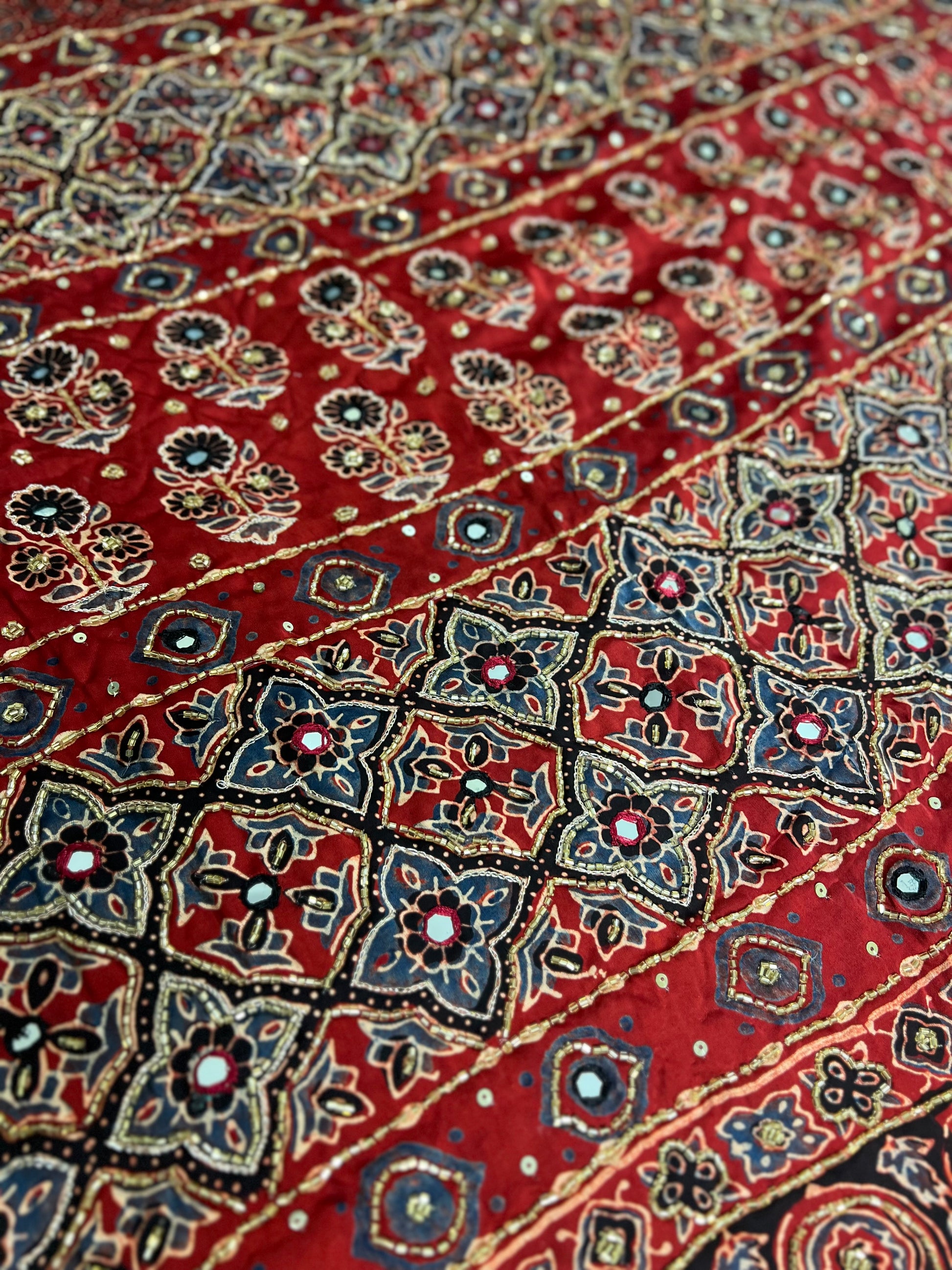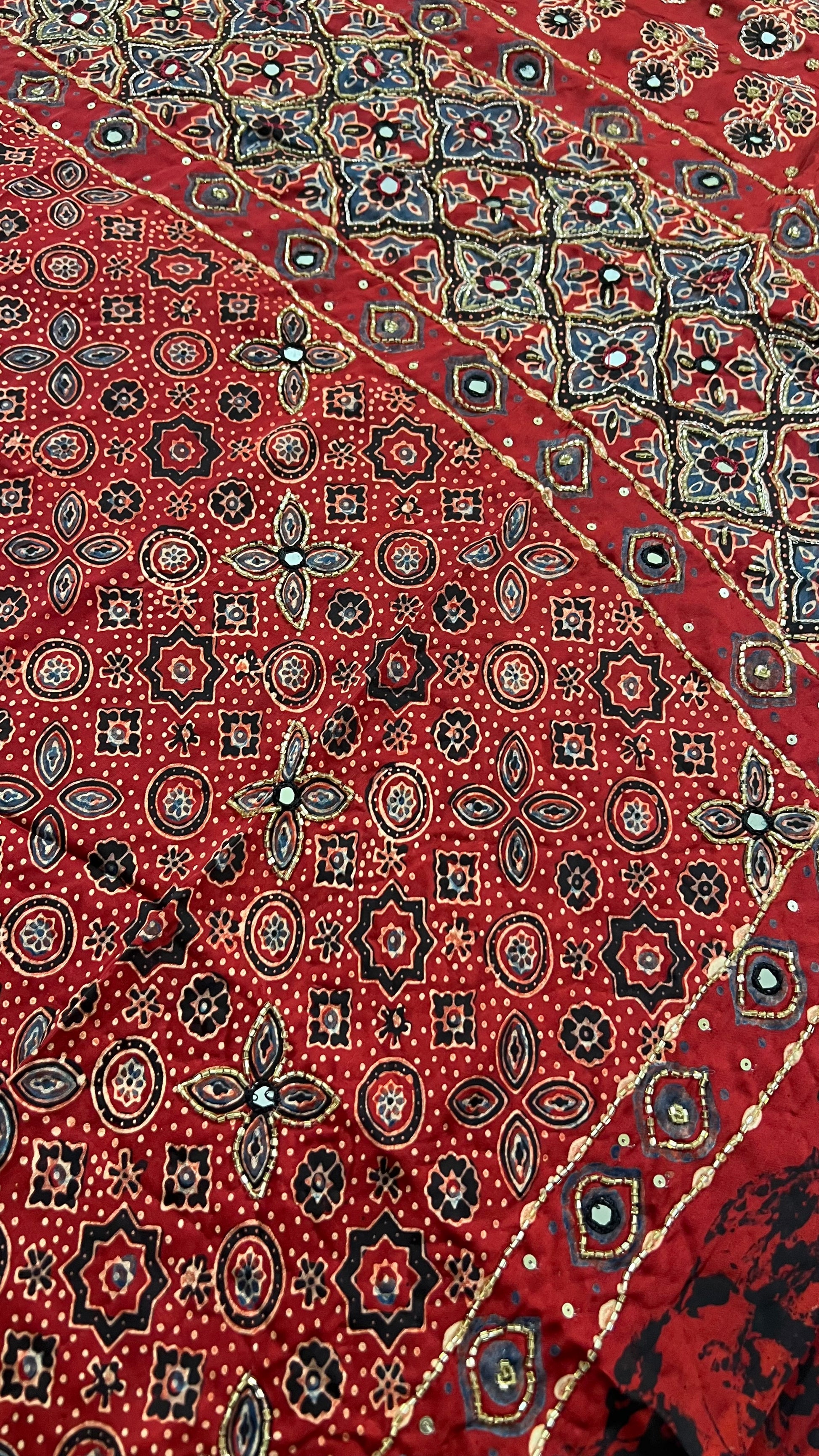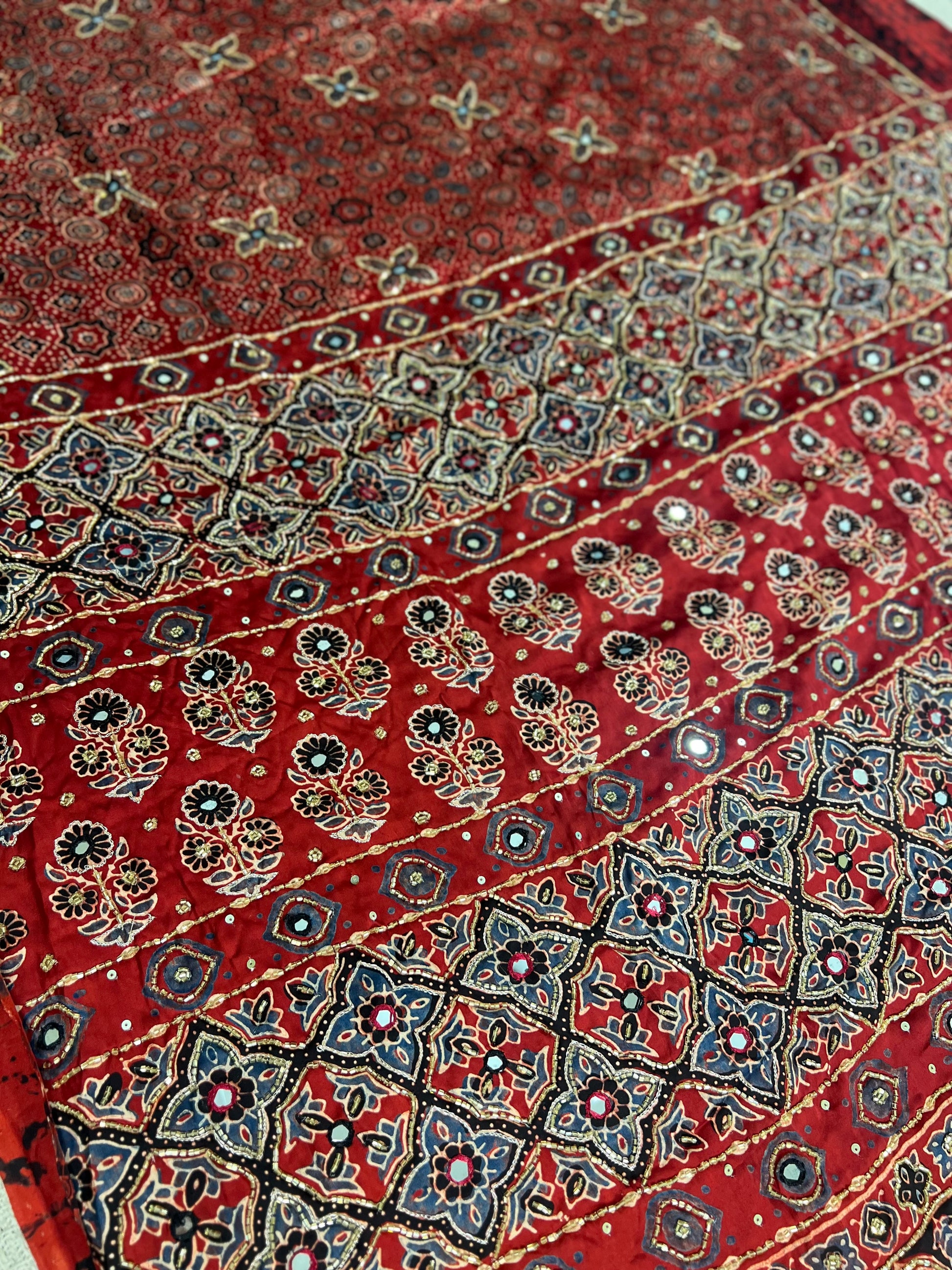 A fiery red modal Ajrakh saree kissed with earthy blue and black hand block motifs, finished with a richly embellished pallu and border of sequins, katdana and mirror work — heritage woven into bold elegance.