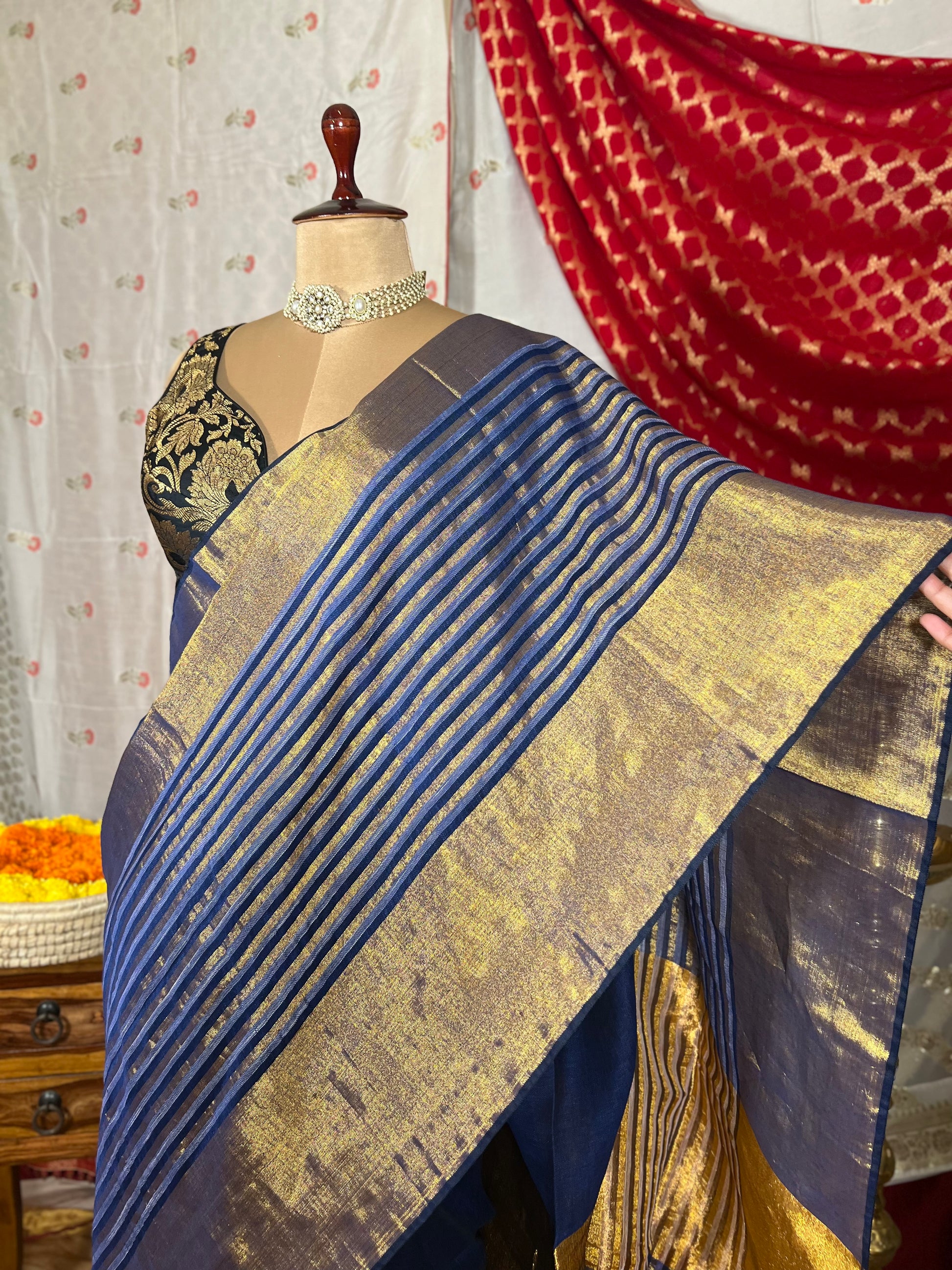 This striking blue linen saree features a lustrous, wide gold zari border that exudes regal elegance. Delicate gold zari lines run parallel above the border and across the pallu, adding to the richness of the saree.