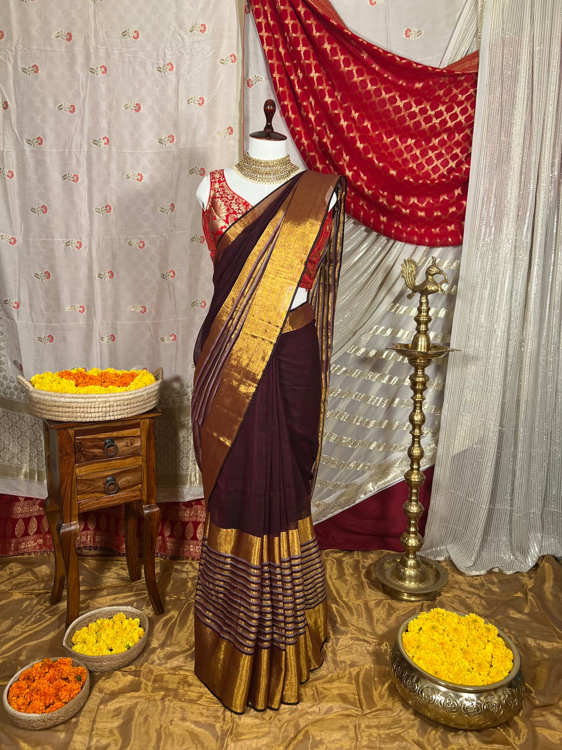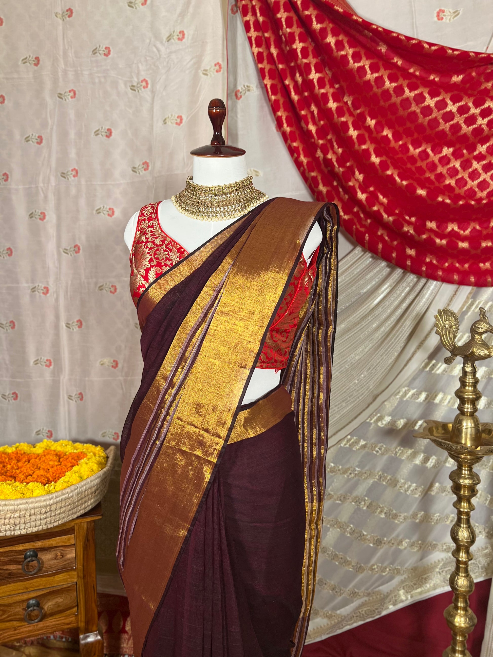 This striking coffee brown linen saree features a lustrous, wide gold zari border that exudes regal elegance. Delicate gold zari lines run parallel above the border and across the pallu, adding to the richness of the saree.